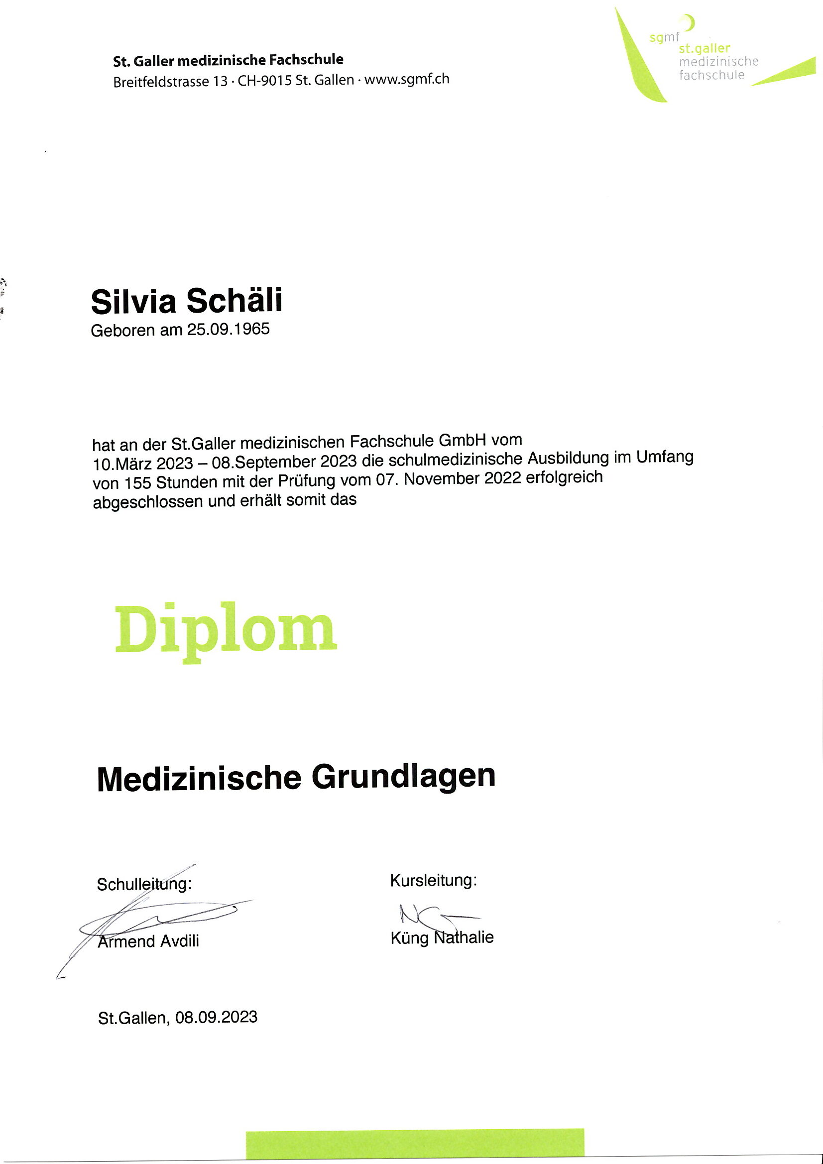 Diplomierter Therapeut Methode 33 absolviert in der Medizinischen Fachschule St. Gallen